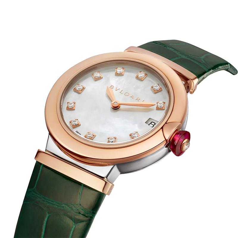 首頁 > 箱包配飾 > 寶格麗 > 【包稅】預定2-3周BVLGARI/寶格麗18K金玫瑰金和精鋼錶殼白色珍珠母貝錶盤鑲有鑲有鑽石的時標日期窗和綠色鱷魚皮錶帶LVCEA自動機械手錶33毫米102640