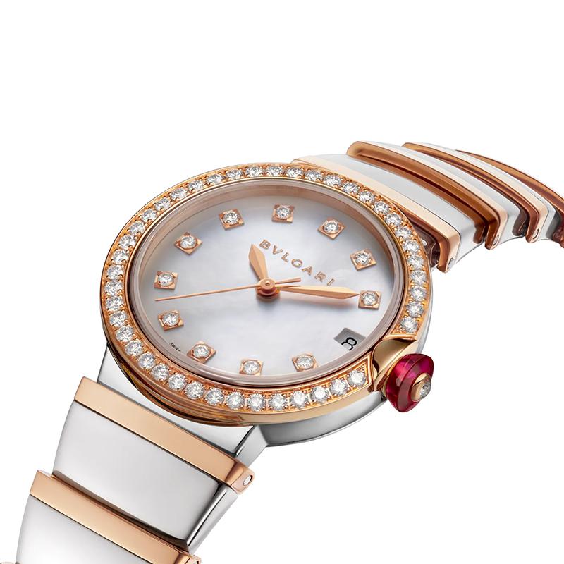 【包稅】預定2-3周BVLGARI/寶格麗錶殼和錶帶由18 K金玫瑰金和不銹鋼製成錶圈鑲有鑽石白色珍珠母貝錶盤鑲有鑽石LVCEA自動機械手錶33毫米102476