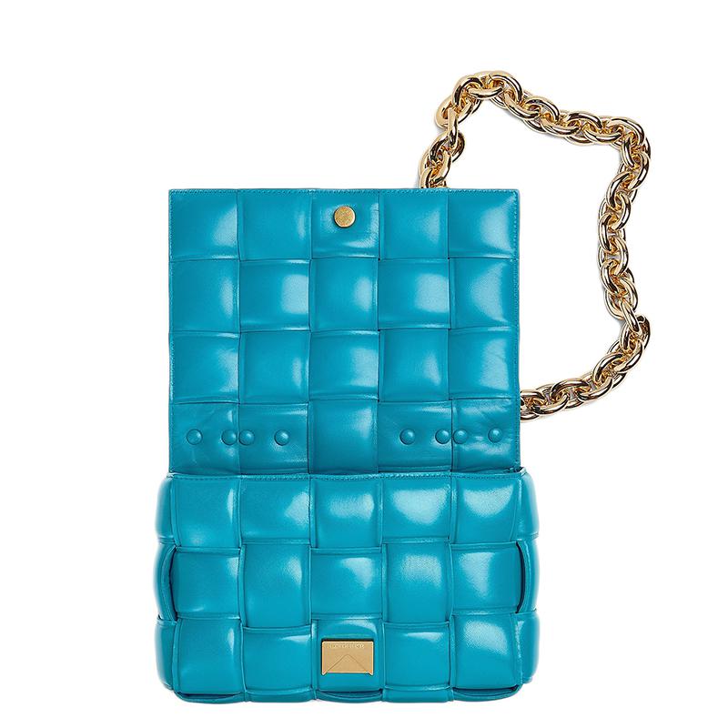 【包税】Bottega Veneta/葆蝶家 21新款CHAIN CASSETTE系列 女士野鸭绿小羊皮编织金链单肩斜挎豆腐包631421VBWZ03118