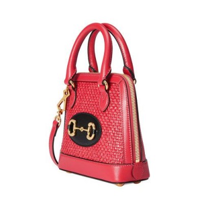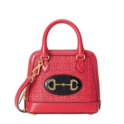 【包稅】GUCCI/古馳2021春夏新款Horsebit 1955系列女士迷你珊瑚草色稻草織物手提斜挎單肩包6407162VAAG6569