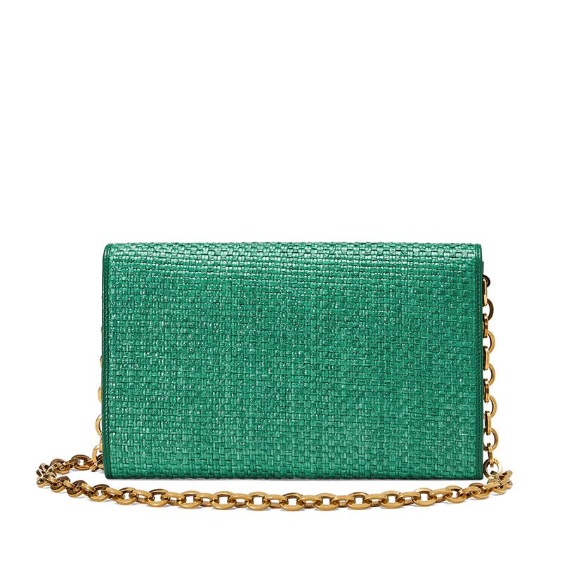 Maison钟爱的系列之一Gucci Horsebit 1955系列的宇宙充满了百搭混合轮廓。单肩包饰有可拆卸链带,眨眼间就变成了手拿包。配件的金色Horsebit细节与翠绿色的稻草效果织物相结合。