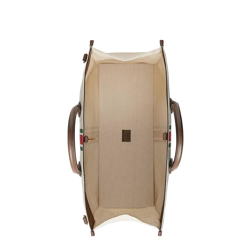 【包稅】GUCCI/古馳21春夏新款pliable系列大號米色亞麻帆布紅綠條紋細節棕色皮革手柄單肩手提包‎6588762U2AG8686
