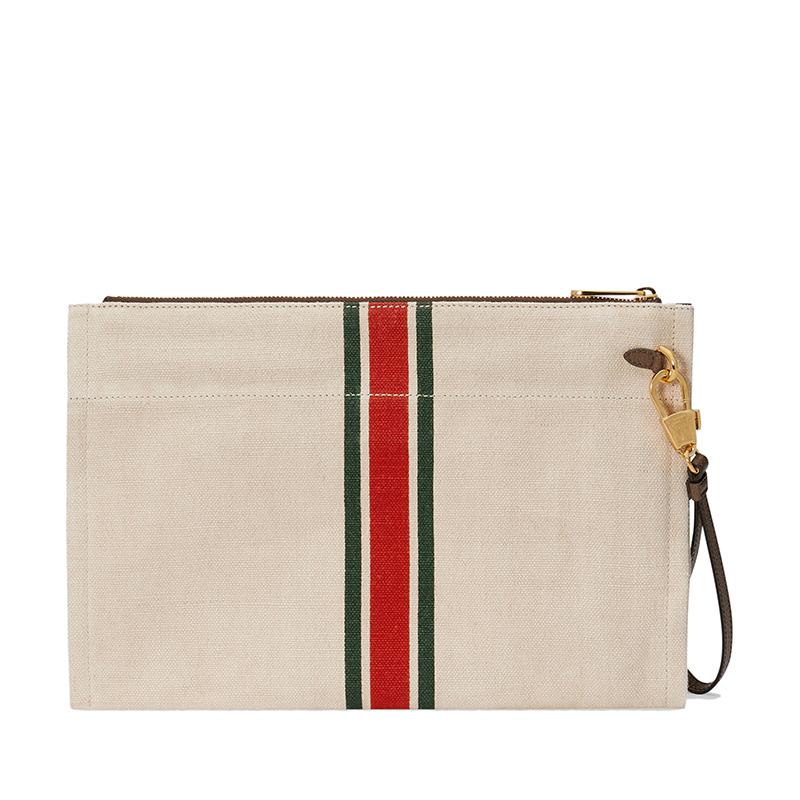 【包稅】GUCCI/古馳21春夏新款男士米色亞麻紅綠條紋GG皮革標誌拉鍊手拿包6575922U2AG8686
