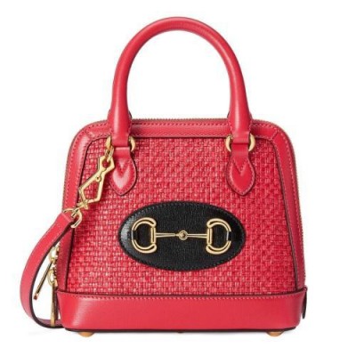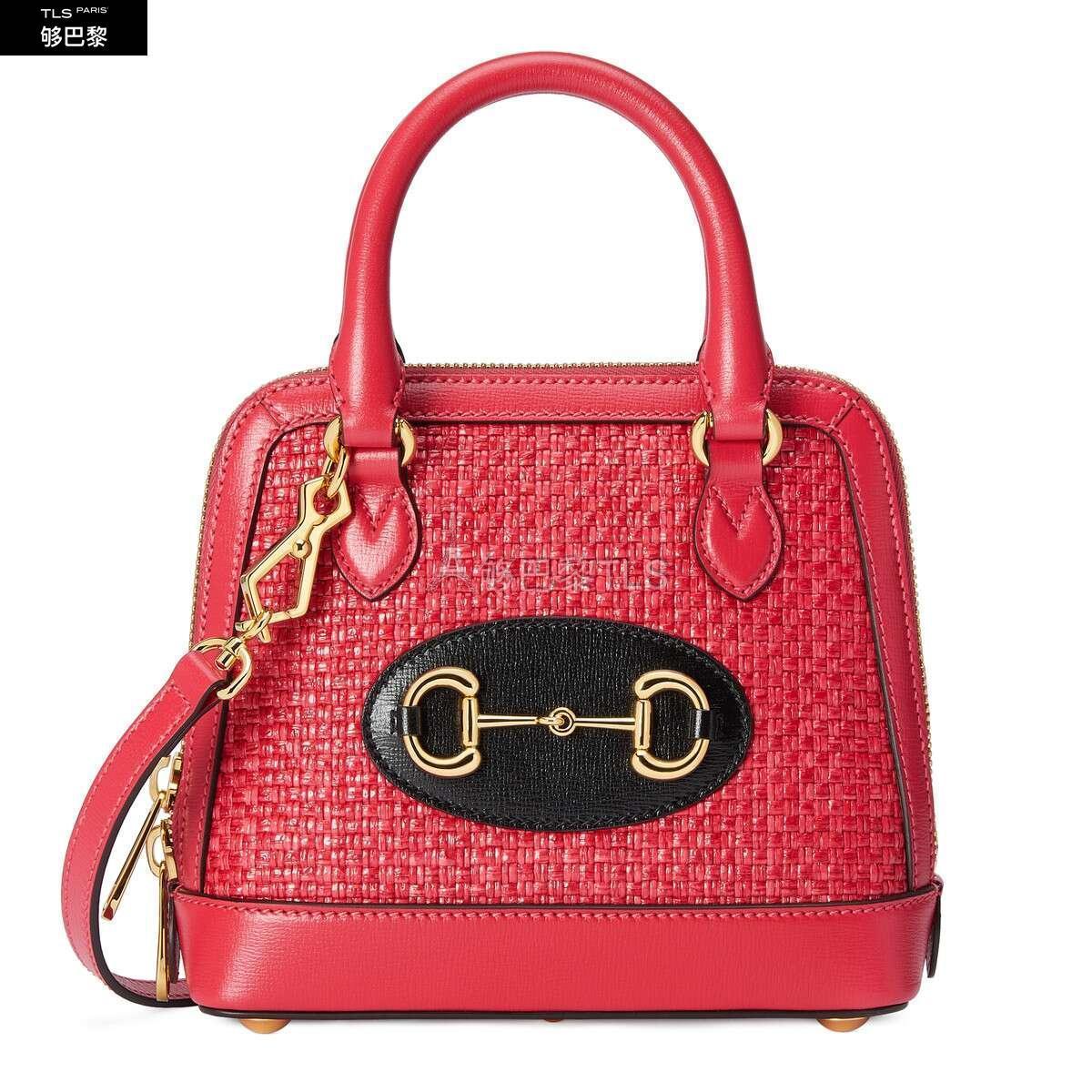 Gucci马衔扣1955系列运用纹理草编效果织物融合鲜艳明快的色调,重塑了对现代优雅的解读。这款迷你手提包采用柔和的珊瑚红色草编效果织物材质制作而成。