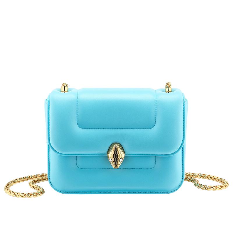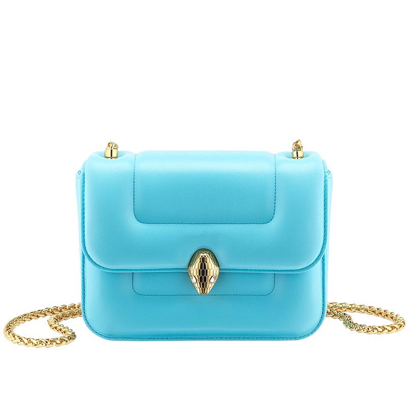 【包稅】預售一個月BVLGARI/寶格麗MARY KATRANTZOU聯名靈蛇蛻變女士藍色柔軟納帕皮Serpenti金色黃銅錶扣水晶蛇頭單肩斜挎手提包291070