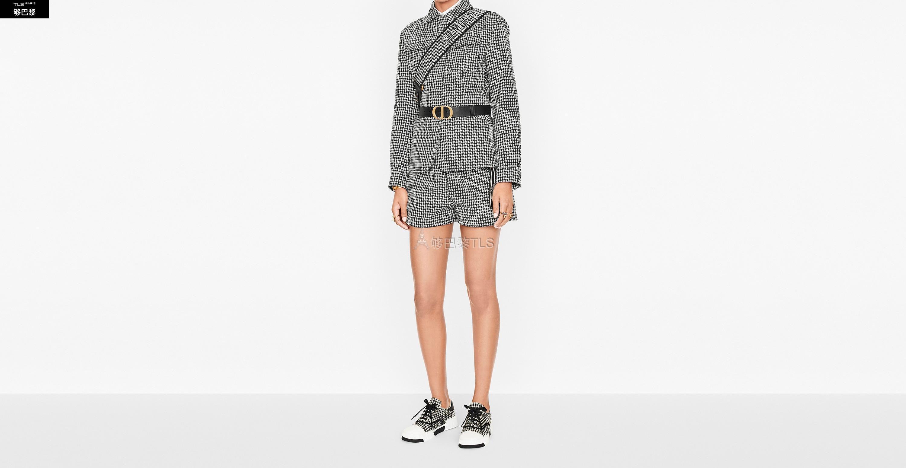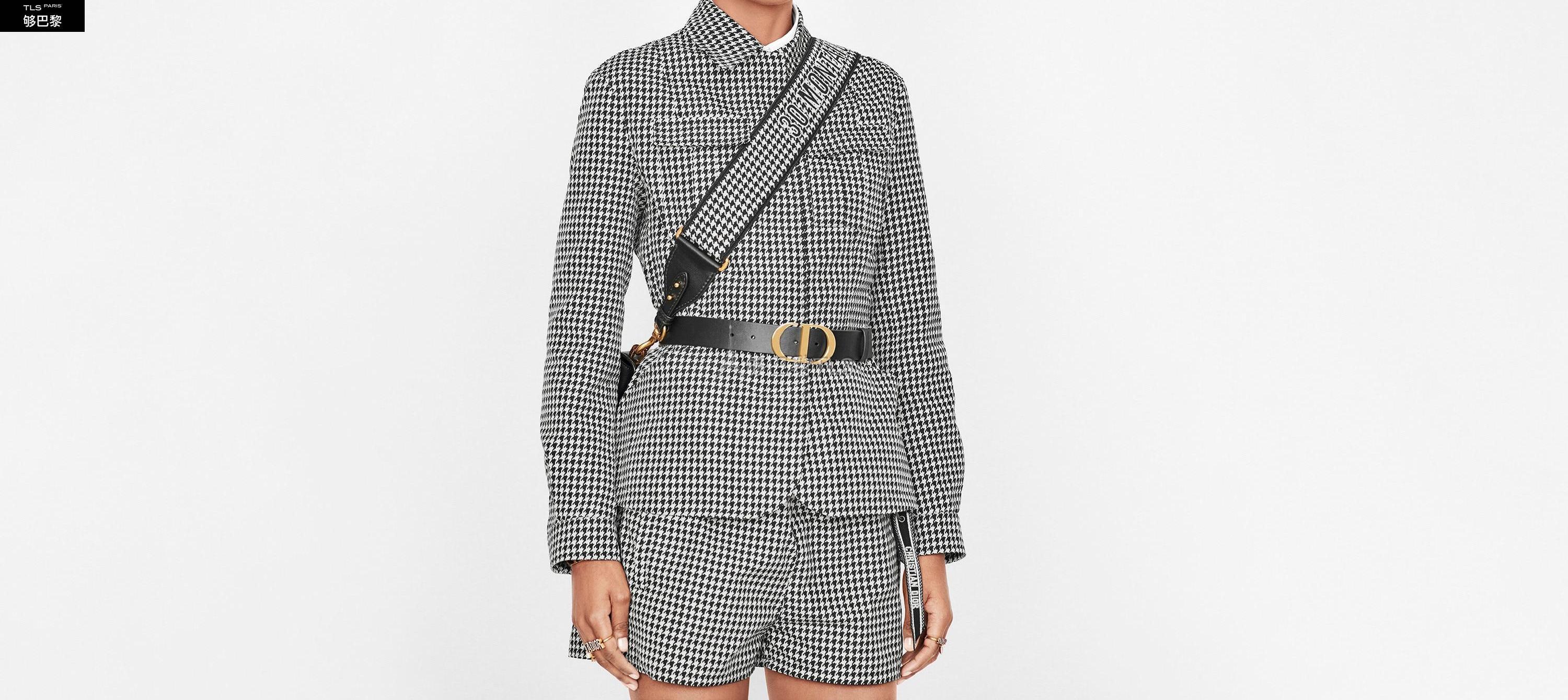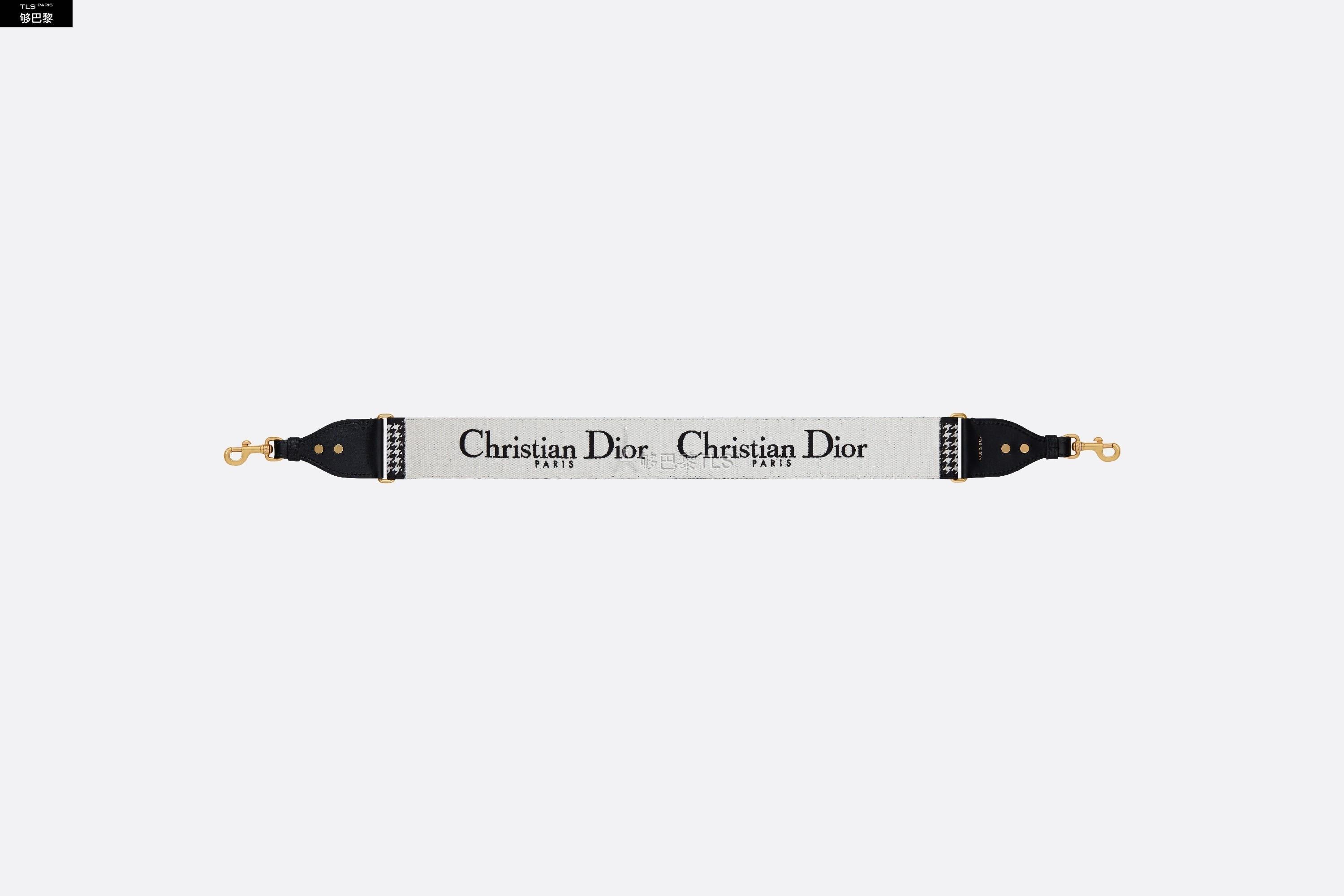 La bandouliere 30 Montaigne est issue de la ligne emblematique de la Maison. Son design tres visuel grace au motif pied-de-poule brode sur toute la largeur est rehausse de la signature "30 Montaigne". Chaque extremite est completee d’accents en cuir de veau noir ainsi que deux crochets a mousqueton en metal a finition or vieilli pour s’accrocher facilement au sac. Cette bandouliere noire et blanche se portera a l'epaule pour un style tres personnel.