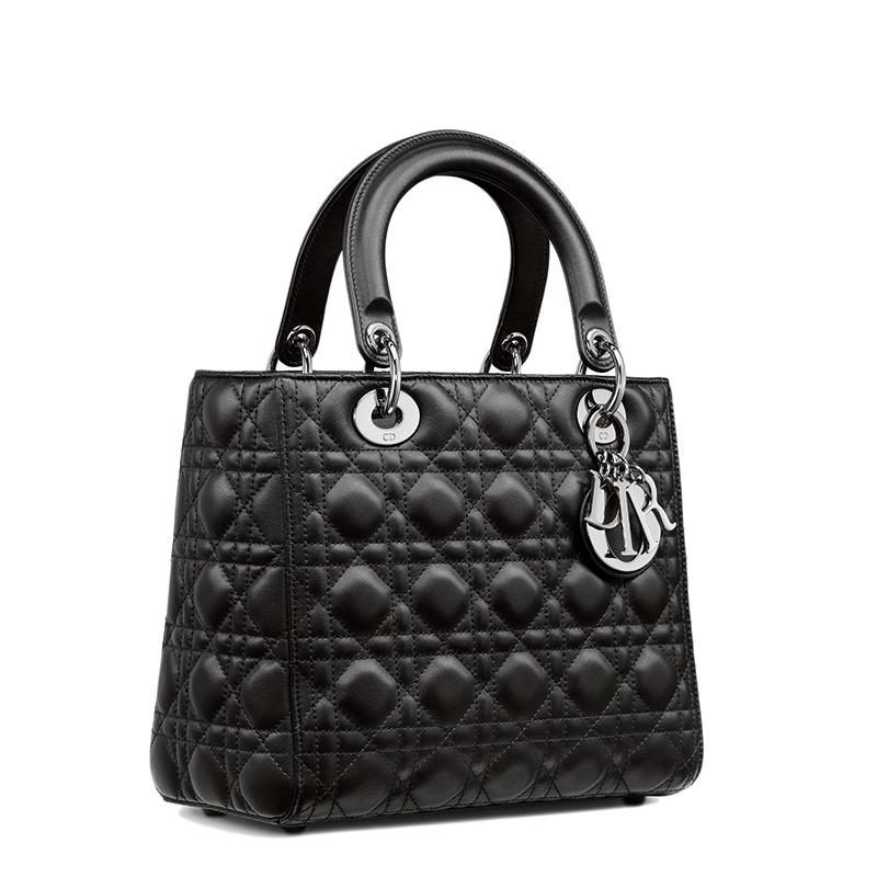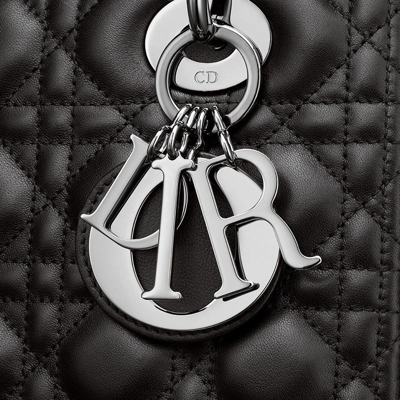 Lady Dior手提包体现了Dior家居优雅和美丽的景象。精致而女性化,这种永恒的创作仍然流行。它采用black缝的黑色小羊皮制成,缝的纹理可立即识别,并配以同色麂皮内饰。DIOR钌金饰物带来优雅气息。Lady Dior中号手提包配有细细可移动的皮革表带,可以手提在肩上或斜挎包上。