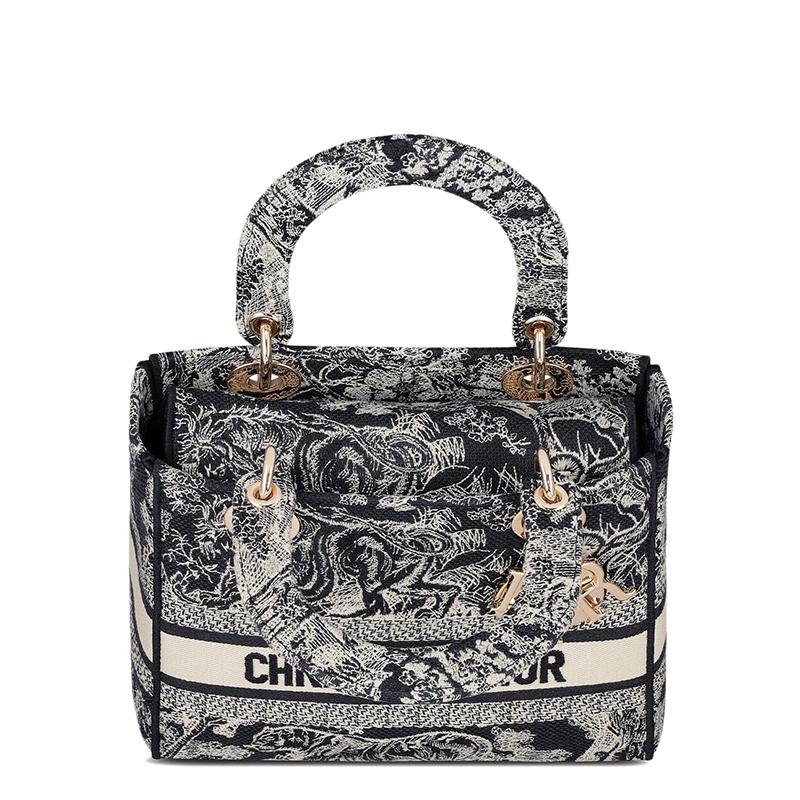 Lady D-Lite手提袋体现了经典优雅与Dior品牌现代感的结合。这款作品完全绣有蓝色Toile de Jouy反向图案,通过倒置配色方案降低了品牌的象征性图案。正面饰有CHRISTIAN DIOR签名,而厚实的DIOR浅金色金属饰物则增添并照亮其轮廓。这款Lady D-Lite中号手提袋带有大号刺绣,可翻转和可拆卸的肩带,可以手提在肩上或斜挎包上。