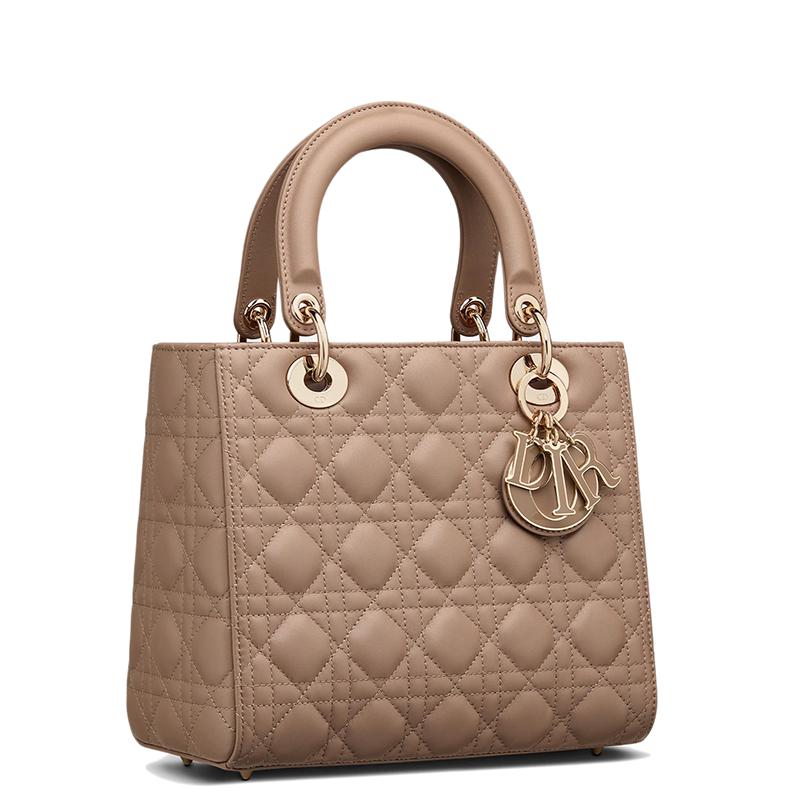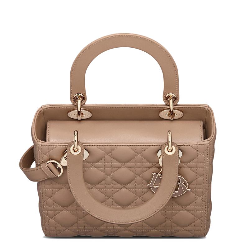 Lady Dior手提包体现了Dior家居优雅和美丽的景象。精致而女性化,这种永恒的创作仍然流行。它采用灰褐色小羊皮和Cannage缝线制成,缝纹理可立即识别。DIOR吊饰以音色珐琅装饰,散发出优雅的魅力。Lady Dior中号手提包配有细细可移动的皮革表带,可以手提在肩上或斜挎包上。