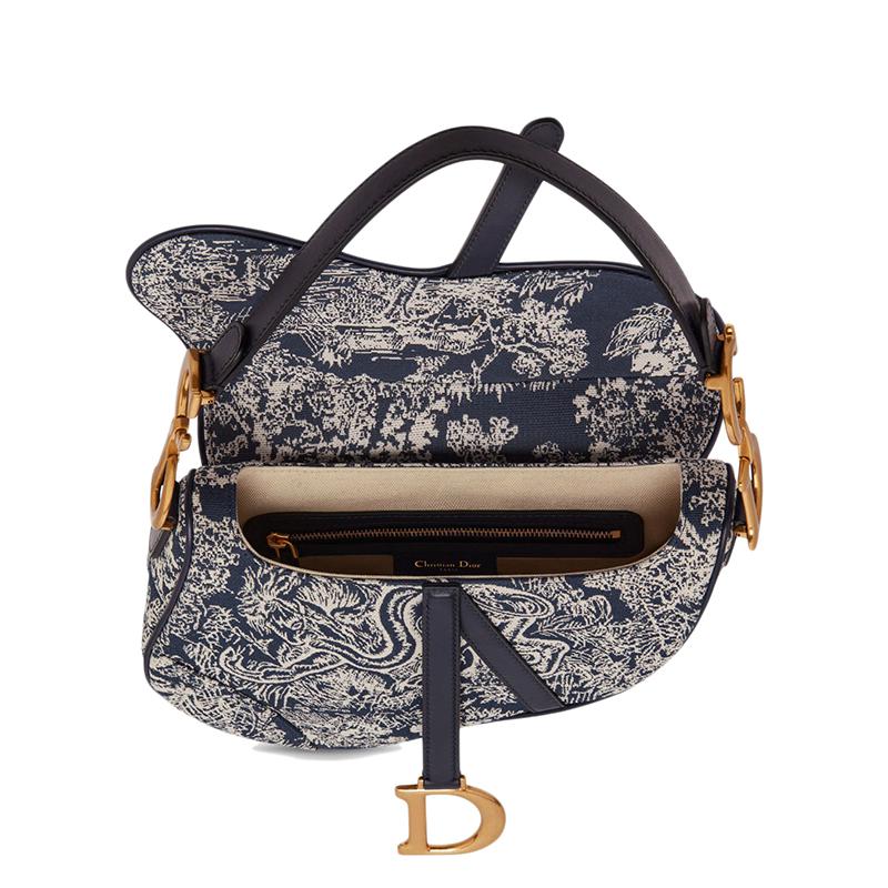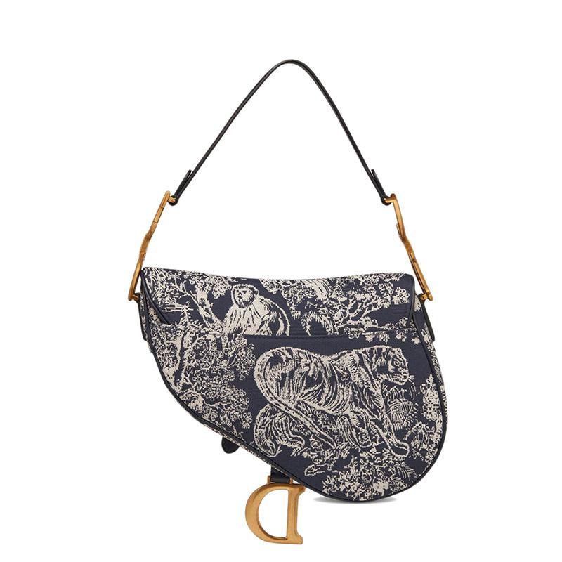 标志性的马鞍包由Maria Grazia Chiuri带来。它采用提花帆布制成,采用蓝色Toile de Jouy Reverse,通过倒置配色方案呈现品牌的标志性图案。它具有传奇色彩的设计包括带有磁性D形环扣的Saddle翻盖,以及在过时的金色金属手柄两侧的CD签名。该马鞍包既可以手提也可以背在肩上,并可以使用不同的肩带进行个性化设置。