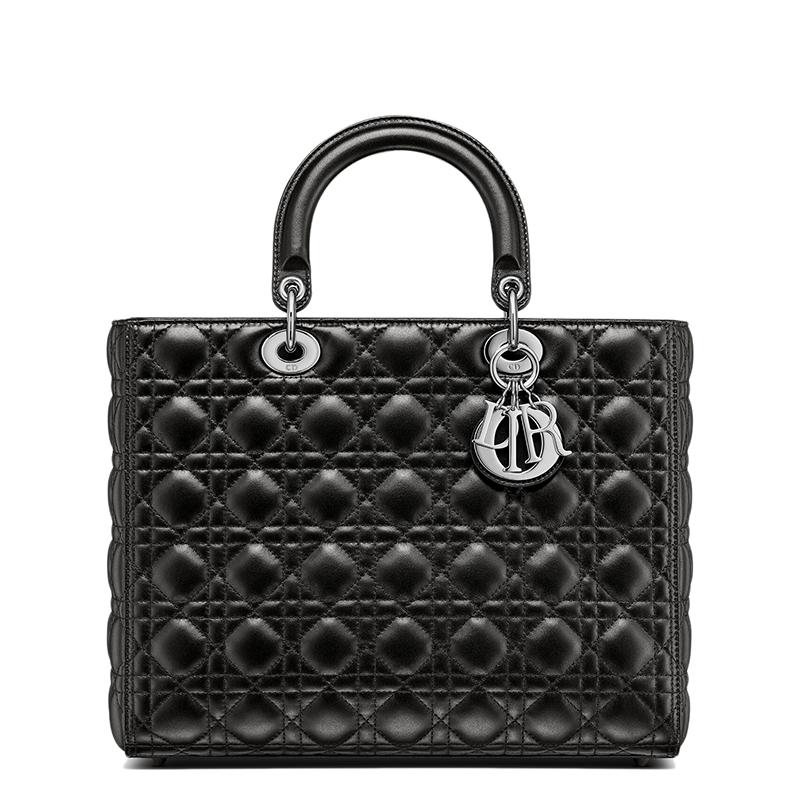 Lady Dior手提包体现了Dior家居优雅和美丽的景象。精致而女性化,这种永恒的创作仍然流行。它采用Cannage缝线的黑色小羊皮制成,其texture缝纹理可立即识别。DIOR钌金饰物带来优雅气息。这款大号Lady Dior手提袋配有可拆卸的细皮革皮带,可以手提在肩上或斜挎包上。