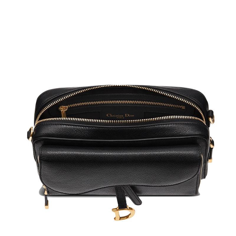 黑色山羊皮迷你手袋采用不对称翻盖和陈年金色金属制成的“ D”字形,代表标志性的Saddle系列标识。此功能性配件可容纳您的日常必需品。可拆卸和可调节的肩带可以用该系列中的刺绣微肩带代替,并且可以戴在肩膀,斜挎包或手上。