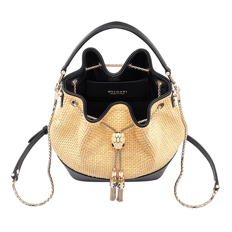 【包稅】BVLGARI/寶格麗2021春夏新款SERPENTI FOREVER系列女士小號米色酒椰纖維和黑色小牛皮金色黃銅蛇頭錶扣水桶單肩斜挎手提包290960