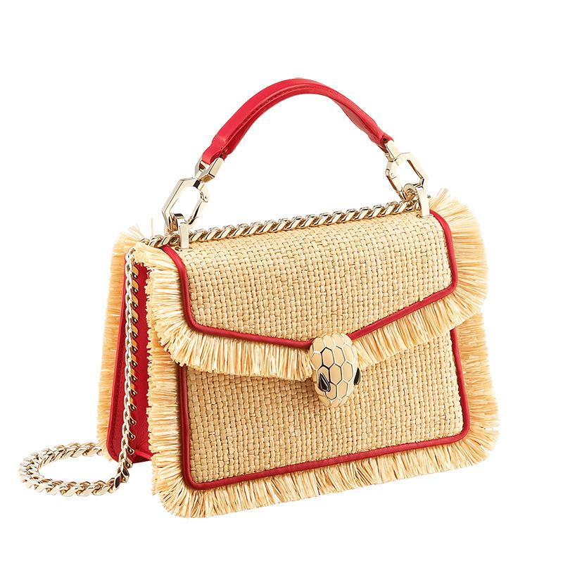 Serpenti Diamond Blast单肩包采用米黄色拉菲草制成,边缘为Carmine Jasper红色小牛皮,米色拉菲草流苏和Carmine Jasper红色纳帕皮革衬里得到了增强。迷人的Serpenti金色黄铜表扣,搭配天然哑光珐琅,纯天然米色和with玛瑙双眼。
