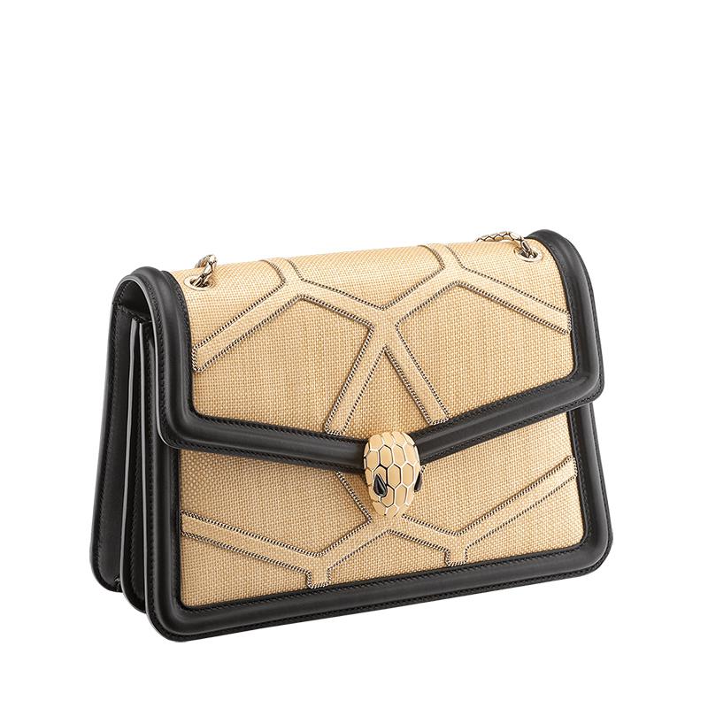 【包税】BVLGARI/宝格丽 2021春夏新款 SERPENTI FOREVER系列 女士米色酒椰叶纤维黑色小牛皮边缘金色黄铜蛇头表扣单肩斜挎手提包290904