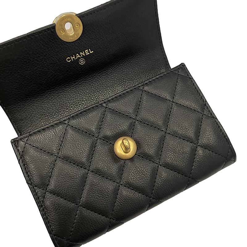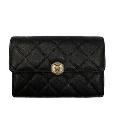 【包稅】CHANEL/香奈兒經典款黑色自然紋理皮革白色樹脂珍珠飾金色金屬雙C扣錢包