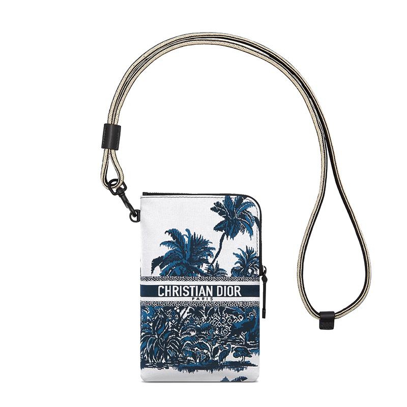 DiorTravel多功能离合器是蓝色技术面料的混合创作,展示了Dior Palms主题,重新诠释了标志性的Toile de Jouy。它由两个可分离的拉链元素组成。小口袋可存放钥匙或找零,而更宽敞的口袋可存放电话。可拆卸的抽绳可将其斜挎在脖子上,也可将其单独放入袋中。