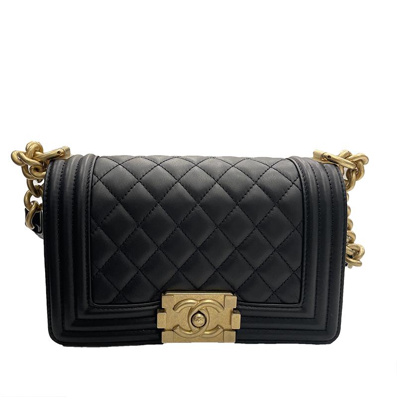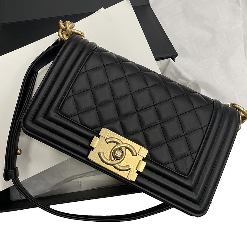 【包稅】現貨CHANEL/香奈兒經典BOY系列黑色皮革金扣鏈條斜挎單肩包AS5584585142254