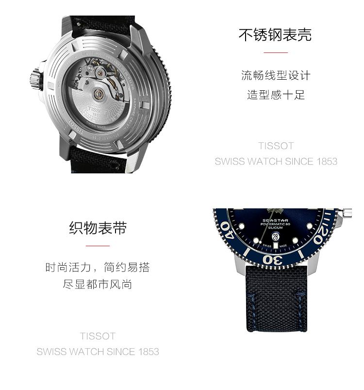 TISSOT/天梭瑞士手表 海星系列织物自动机械运动潜水男士腕表 皮带蓝盘T120.407.17.041.01
