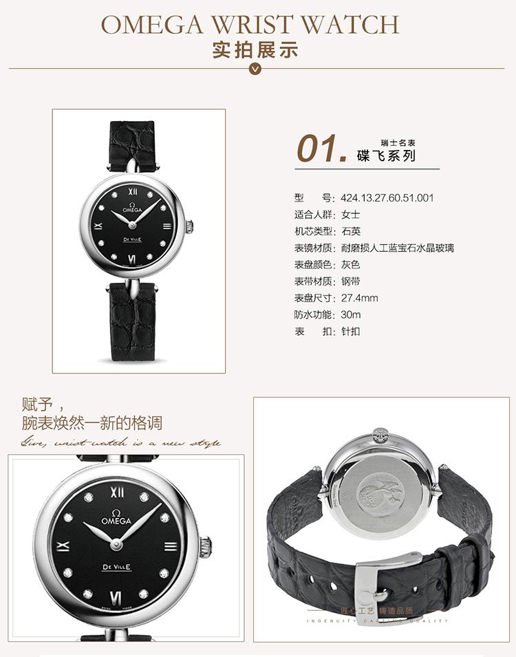 OMEGA/歐米茄瑞士手錶碟飛系列鑲鑽女士石英腕表皮帶黑盤424.13.27.60.51.001