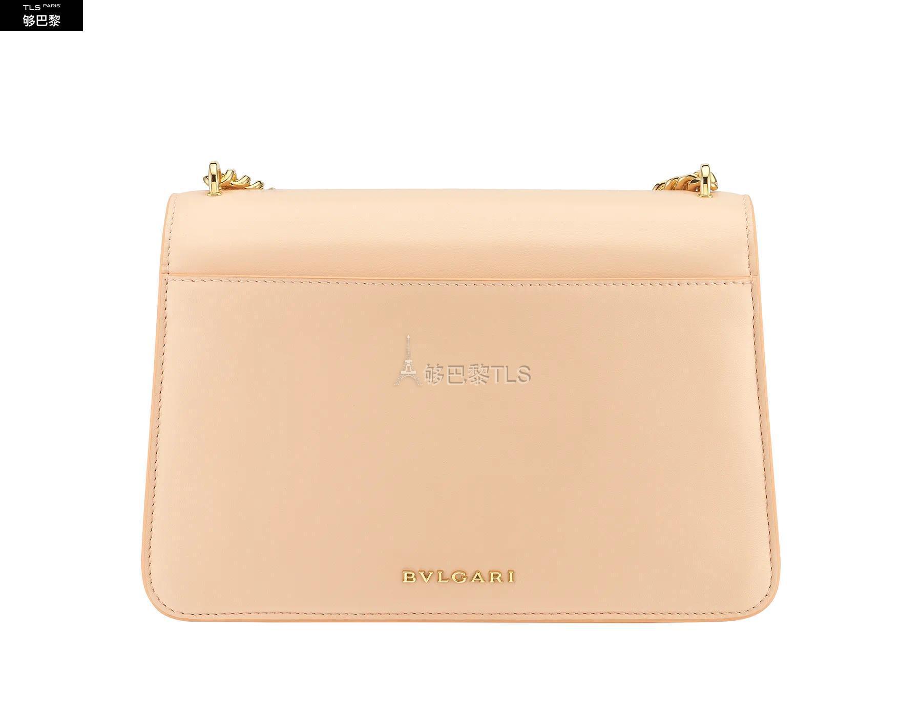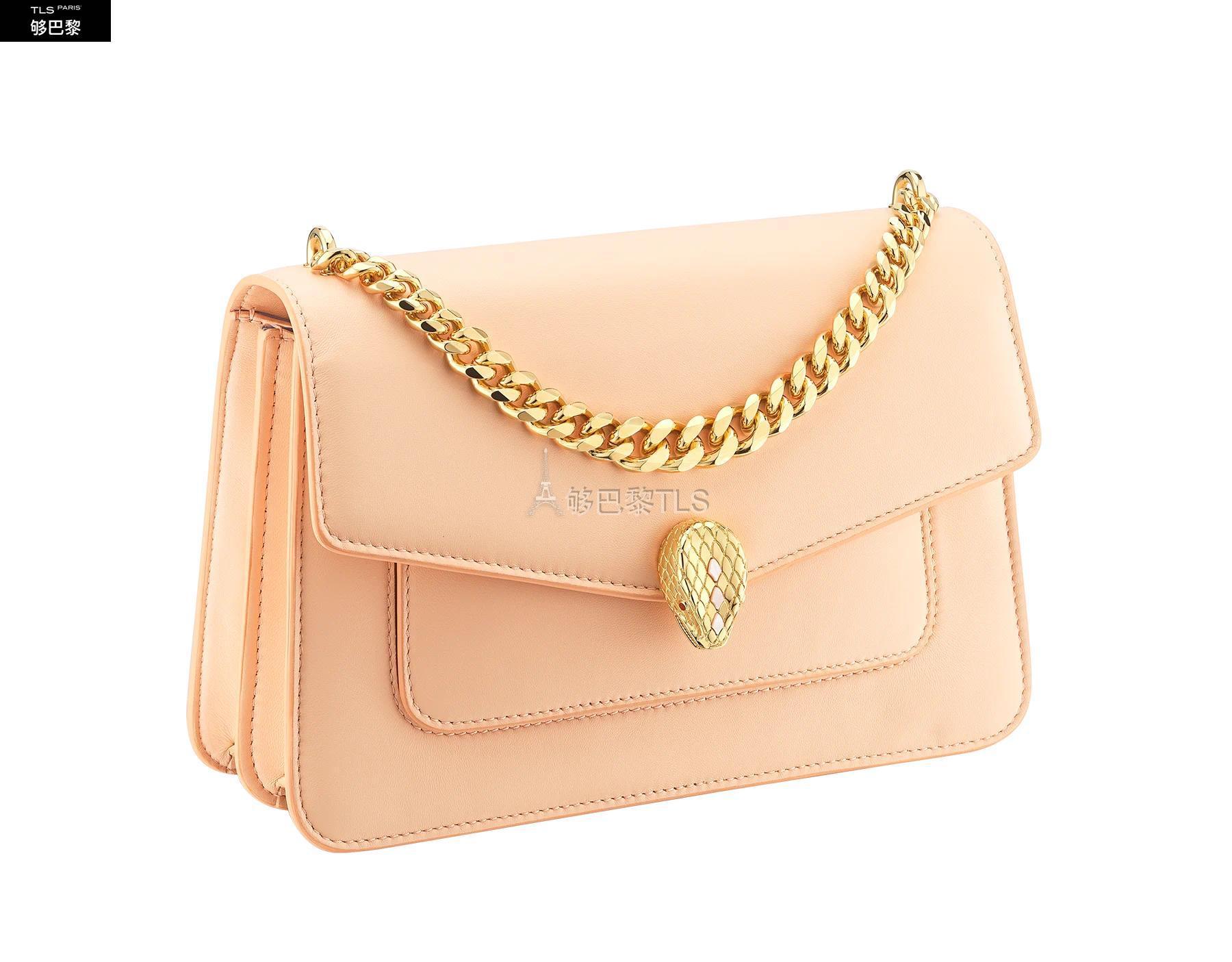 La famille Serpenti Forever accueille un nouveau sac a bandouliere qui affiche une silhouette resolument contemporaine a l’es*W*prit urbain. Confectionne en cuir nappa doux couleur peche, ce sac a chaine maxi arbore des details en laiton dore. Ce modele est orne d'une nouvelle interpretat*w*ion du fermoir Serpenti en laiton dore, inspire par une ancienne montre Bvlgari des annees 60, avec petites ecailles en nacre rose et yeux en email rouge. Clin d’oeil a l’ame du joaillier, une chaine Bvlgari emblematique ton sur ton orne le rabat a l’image d’un collier, qui peut egalement se convertir en une poignee raffinee. Moyen modele avec un compartiment et une bandouliere en cuir detachable et reglable. Une poche ouverte, une poche zippee de separation et un miroir personnalisable completent ce modele a l'interieur. Une poche avant et une poche arriere plaquee parachevent le sac a l'exterieur. Dimensions : 25 x 1