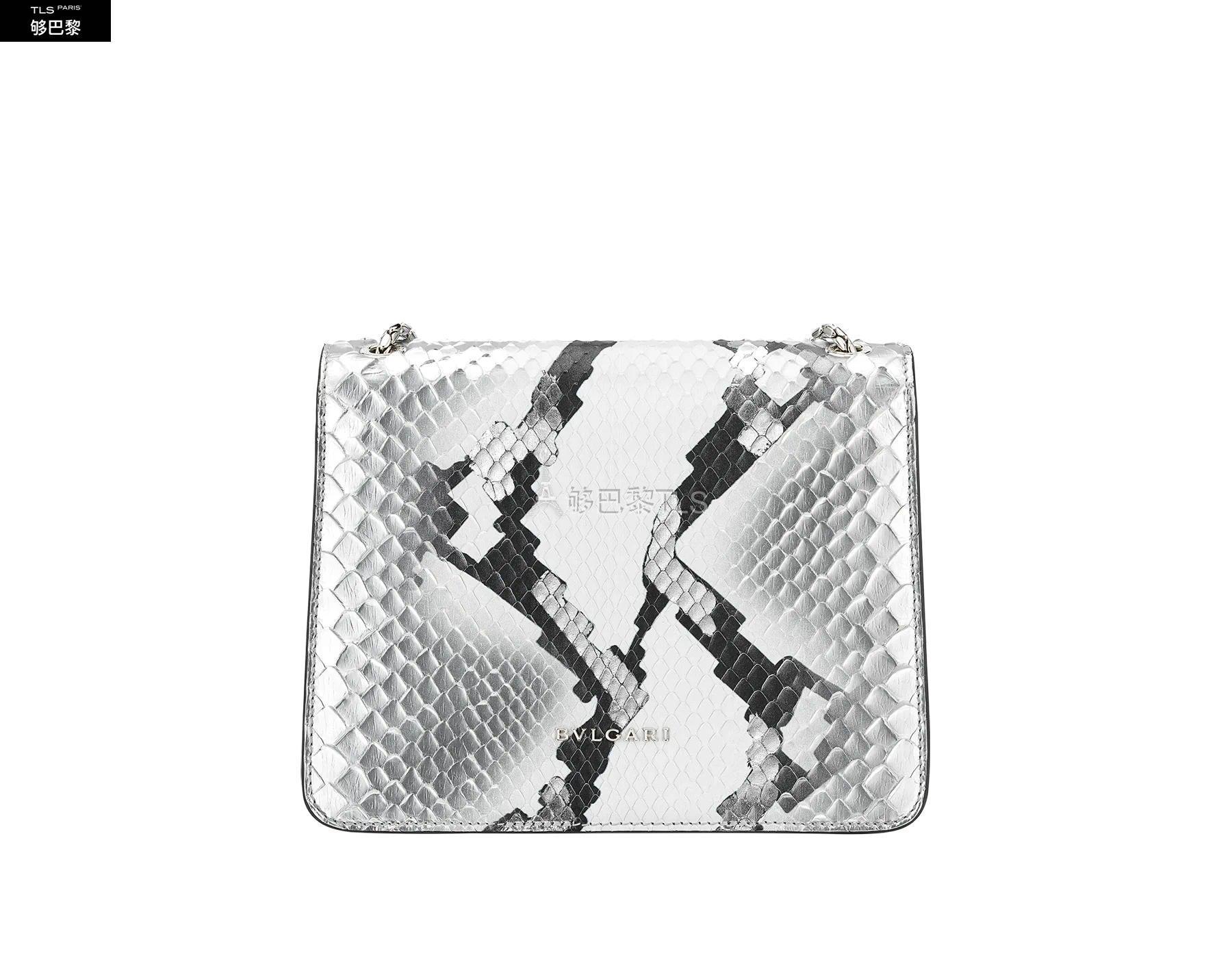 Le sac a bandouliere Serpenti Forever revet de nouvelles couleurs pour la saison. Ce modele en python raffine « Ice Glam » blanc, argente et noir illustre la capacite des artisans Bvlgari a transformer des materiaux precieux en des pieces intemporelles. Le fermoir emblematique Serpenti en email noir hypnotise avec ses yeux en onyx au cha*W*rme envoutant. Une chaine en laiton, inspiree par l’allure sinueuse du serpent, et un petit miroir de poche completent l’ensemble. Petit modele dote d’un compartiment a soufflet. Dimensions : 20 x 14 x 4,5 cm.